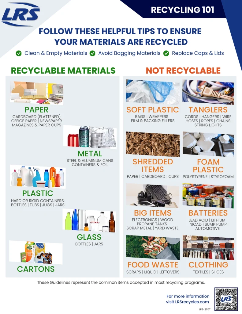 Different municipalities may have different requirements on what can be collected. To learn more please Contact Us or call us at 844.NEED.LRS. One of our representatives will provide needed clarification and direction on local recycling requirements.
